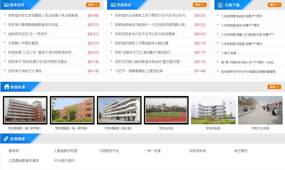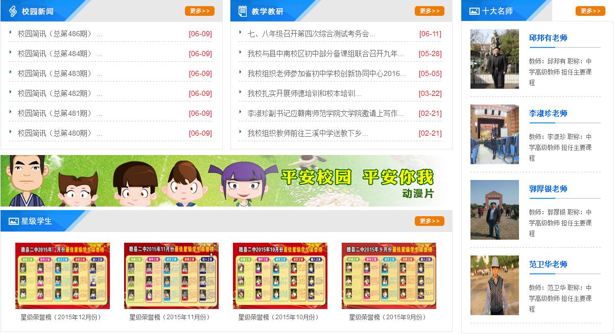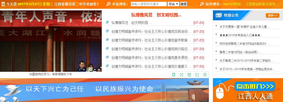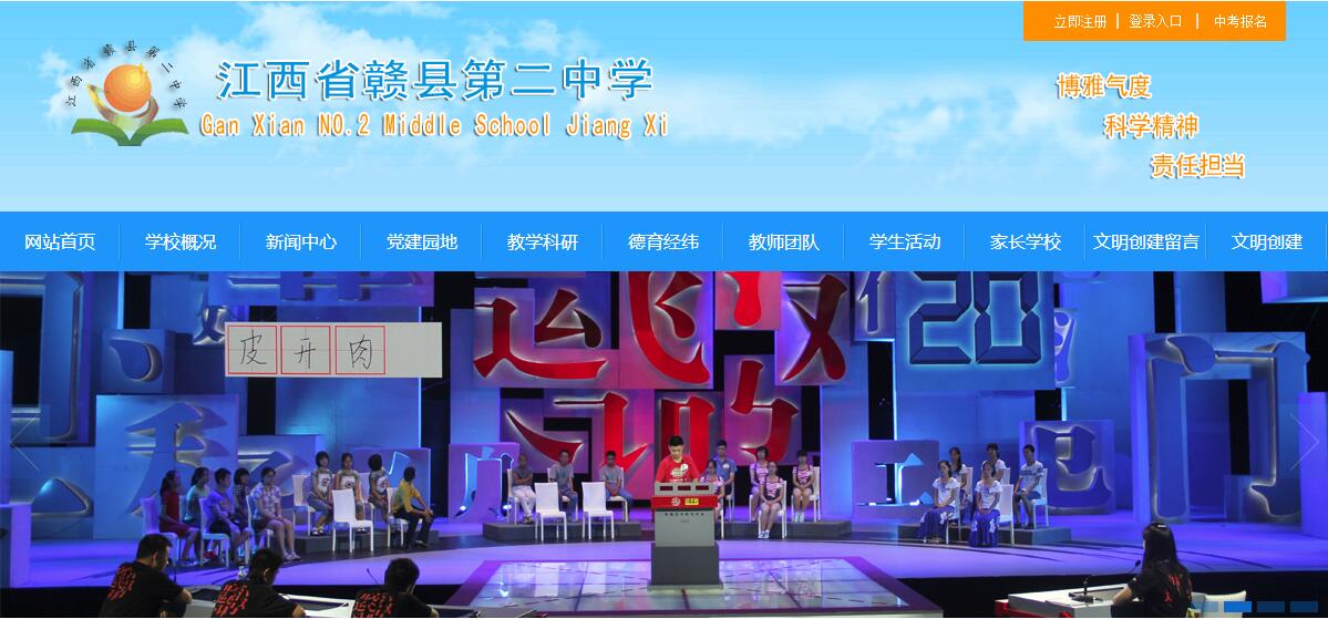 江西省贛縣第二中學(xué)校園占地60畝,在校學(xué)生4180人,共61個(gè)教學(xué)班;教職工195人,其中:國(guó)家級(jí)優(yōu)秀教練員1人,省特級(jí)教師1人,省學(xué)科帶頭人4人,省十佳班主任1人,省十佳語(yǔ)文教師1人,省骨干教師16人,市學(xué)科帶頭人和骨干教師31人。 贛縣二中以“博學(xué)多思、博德廣善、博愛泛眾;舉止優(yōu)雅、言行文雅、情趣高雅”為精神內(nèi)涵,以“民主治校、科學(xué)管理、共筑和諧、提升質(zhì)量”的辦學(xué)理念,以“全市起示范、全省爭(zhēng)地位、全國(guó)有影響”為奮斗目標(biāo),以“人文為本、制度為準(zhǔn)、工作為重”為職業(yè)素養(yǎng),以“團(tuán)結(jié)進(jìn)取、吃苦耐勞、開拓創(chuàng)新、樂觀向上”為文化核心,以“環(huán)境更優(yōu)美、條件更現(xiàn)代、理念更先進(jìn)、校風(fēng)更純正、質(zhì)量更卓越”為基本任務(wù),“傳承 “篤志、博學(xué)、厚德、自律”校訓(xùn),形成了“愛崗敬業(yè)、開拓進(jìn)取”的教風(fēng)和“求知、健體、懂事、創(chuàng)新”的學(xué)風(fēng)。 全體二中人與時(shí)俱進(jìn),開拓創(chuàng)新,取得一系列成就。中考成績(jī)高分段人數(shù)、特優(yōu)生、優(yōu)生人數(shù)及一分兩率等各項(xiàng)指標(biāo)名列前茅。各類競(jìng)賽碩果累累,先后有400多人次獲全國(guó)競(jìng)賽等級(jí)獎(jiǎng),其中有84人次獲全國(guó)競(jìng)賽一等獎(jiǎng),物理學(xué)科兩度榮獲全國(guó)團(tuán)體(江西賽區(qū))一等獎(jiǎng),兩次作為贛州市初中學(xué)校唯一代表參加了江西省教育博覽會(huì)。連續(xù)五次榮獲中國(guó)青少年機(jī)器人競(jìng)賽優(yōu)秀學(xué)校稱號(hào),榮獲中國(guó)青科輔團(tuán)體會(huì)員學(xué)校、全國(guó)青少年科學(xué)調(diào)查體驗(yàn)活動(dòng)試點(diǎn)學(xué)校、全國(guó)未成年人生態(tài)道德教育示范學(xué)校、中國(guó)機(jī)器人競(jìng)賽優(yōu)秀學(xué)校、國(guó)家級(jí)規(guī)范漢字書寫教育特色學(xué)校、中國(guó)宋慶齡少年兒童科技發(fā)明示范學(xué)校、江西省實(shí)施素質(zhì)教育示范學(xué)校、江西省基礎(chǔ)教育課程改革工作先進(jìn)單位、江西省教育系統(tǒng)先進(jìn)集體、江西省航模車模重點(diǎn)學(xué)校等榮譽(yù)稱號(hào)。2013年7月,由中央電視臺(tái)直接指定為江西省初中學(xué)校的唯一代表,參加了央視科教頻道舉辦的首屆中國(guó)漢字聽寫大會(huì),獲得了社會(huì)各界的廣泛贊譽(yù)。