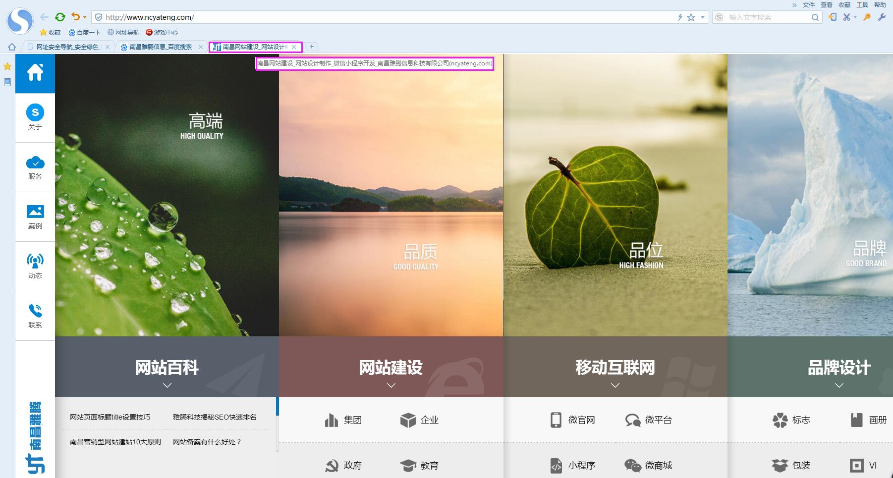 我們之前有看到有些企業(yè)的網(wǎng)站連標(biāo)題都沒有,當(dāng)時特別難以理解是什么樣的程序員寫的網(wǎng)站程序竟然網(wǎng)站沒有標(biāo)題,這樣的網(wǎng)站怎么被搜索引擎收錄?以后怎么做SEO優(yōu)化推廣呢?作為南昌網(wǎng)站建設(shè)專業(yè)的公司,我們深知一個網(wǎng)站的標(biāo)題、網(wǎng)頁的標(biāo)題對于一個網(wǎng)站而言是多么的至關(guān)重要。